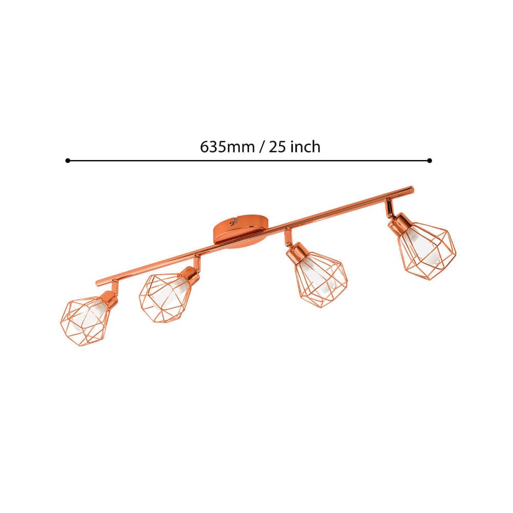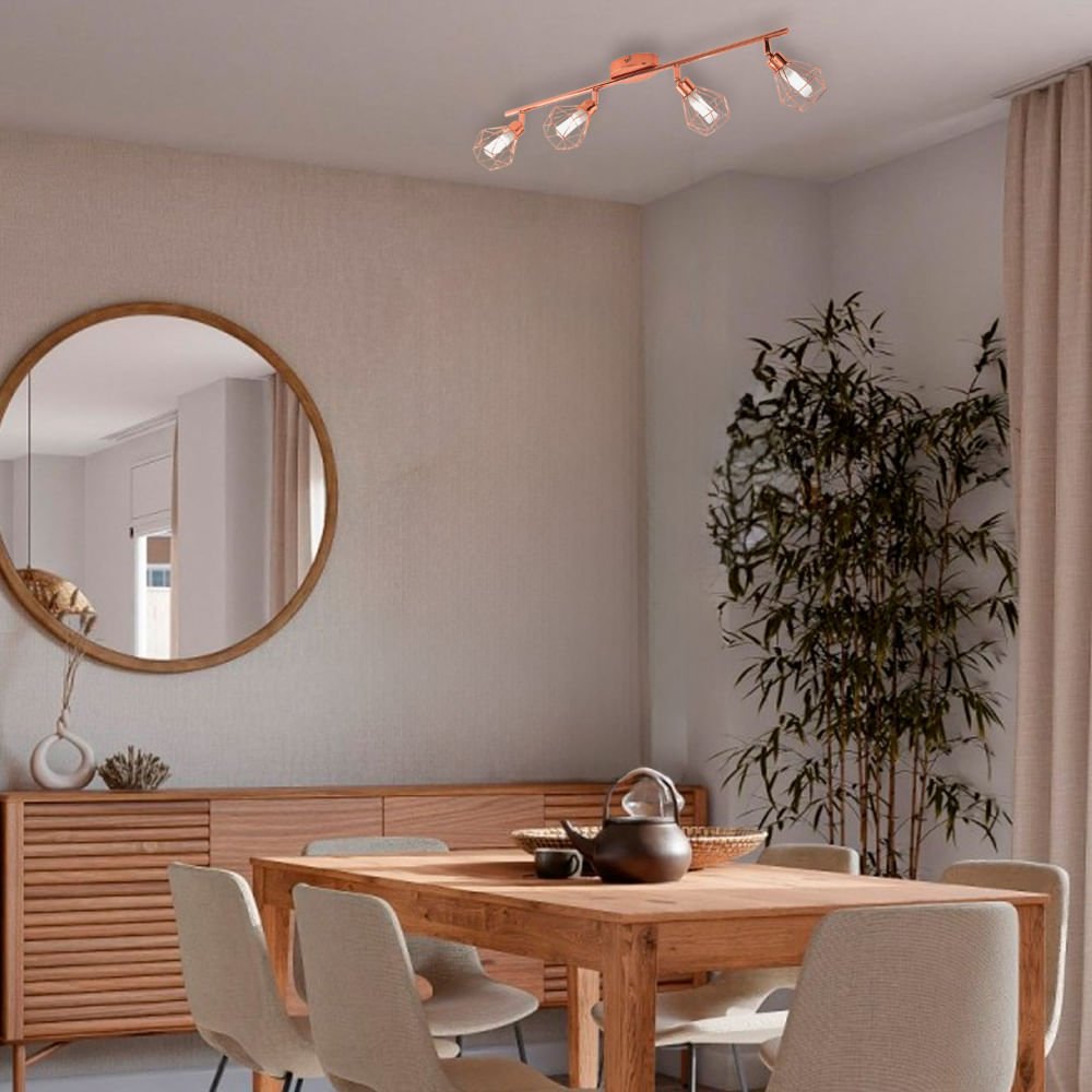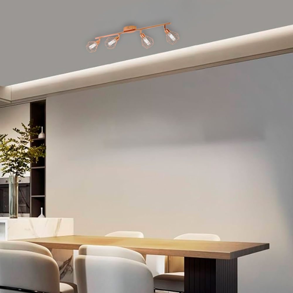 La lámpara de techo LED ZAPATA está compuesta por un cuerpo metálico lineal en color cobre con cuatro cabezales móviles en forma de rombo fabricados en alambre. Cada uno de ellos cuenta con un elemento interno de vidrio satinado en blanco. Las pantallas crean un fascinante juego de luces y sombras en cuanto se encienden.